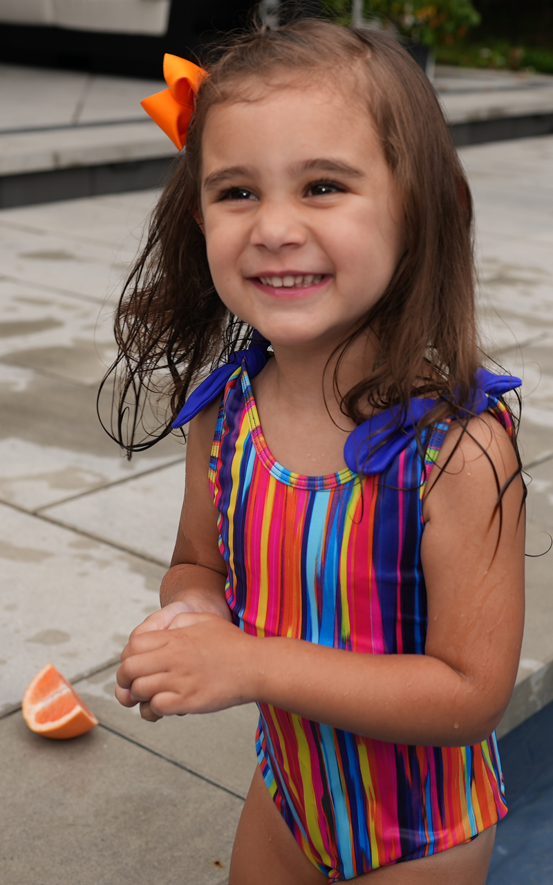 Minnie: Girl's Swimsuit in Neon Orange with Magenta Bows